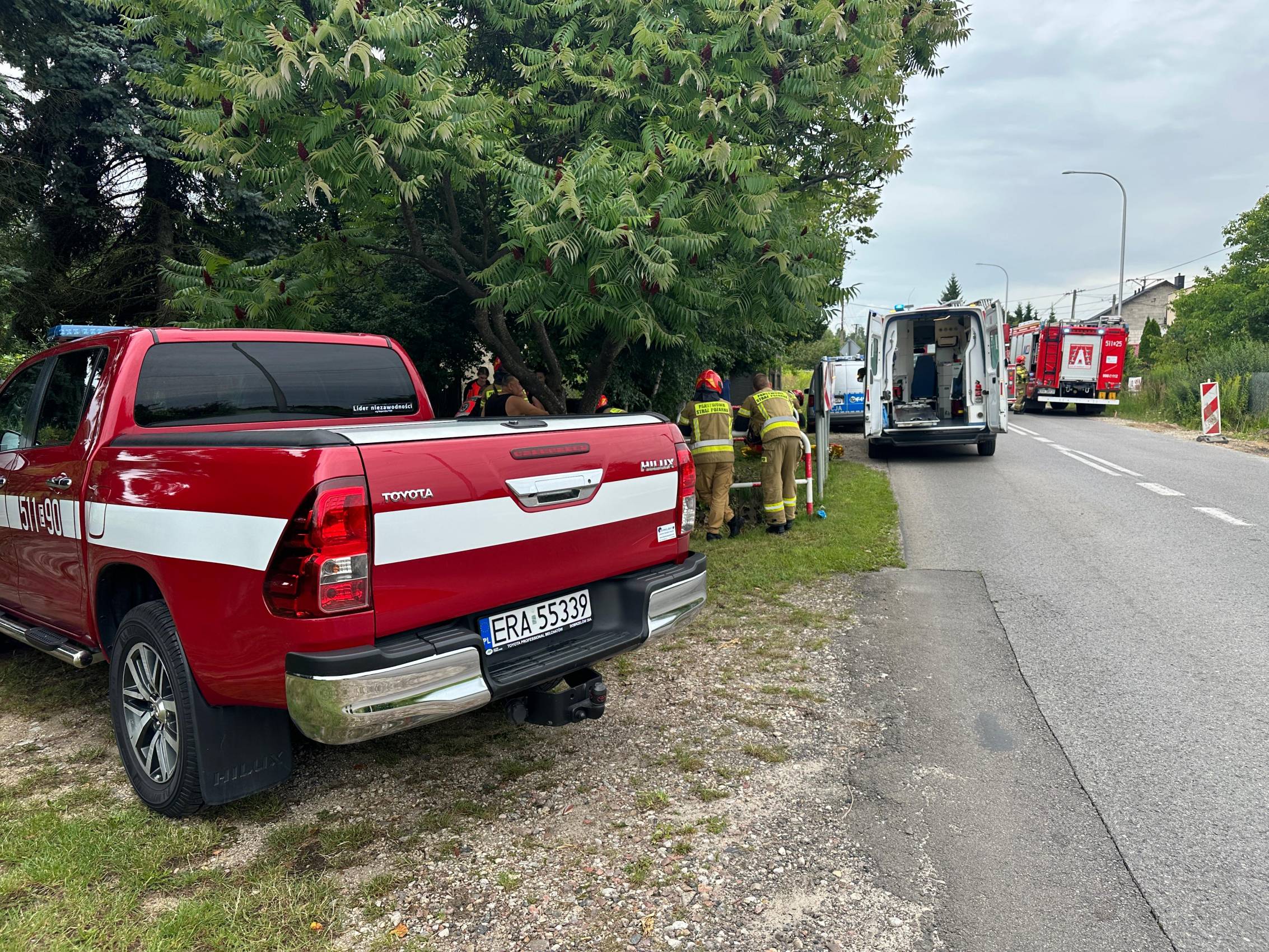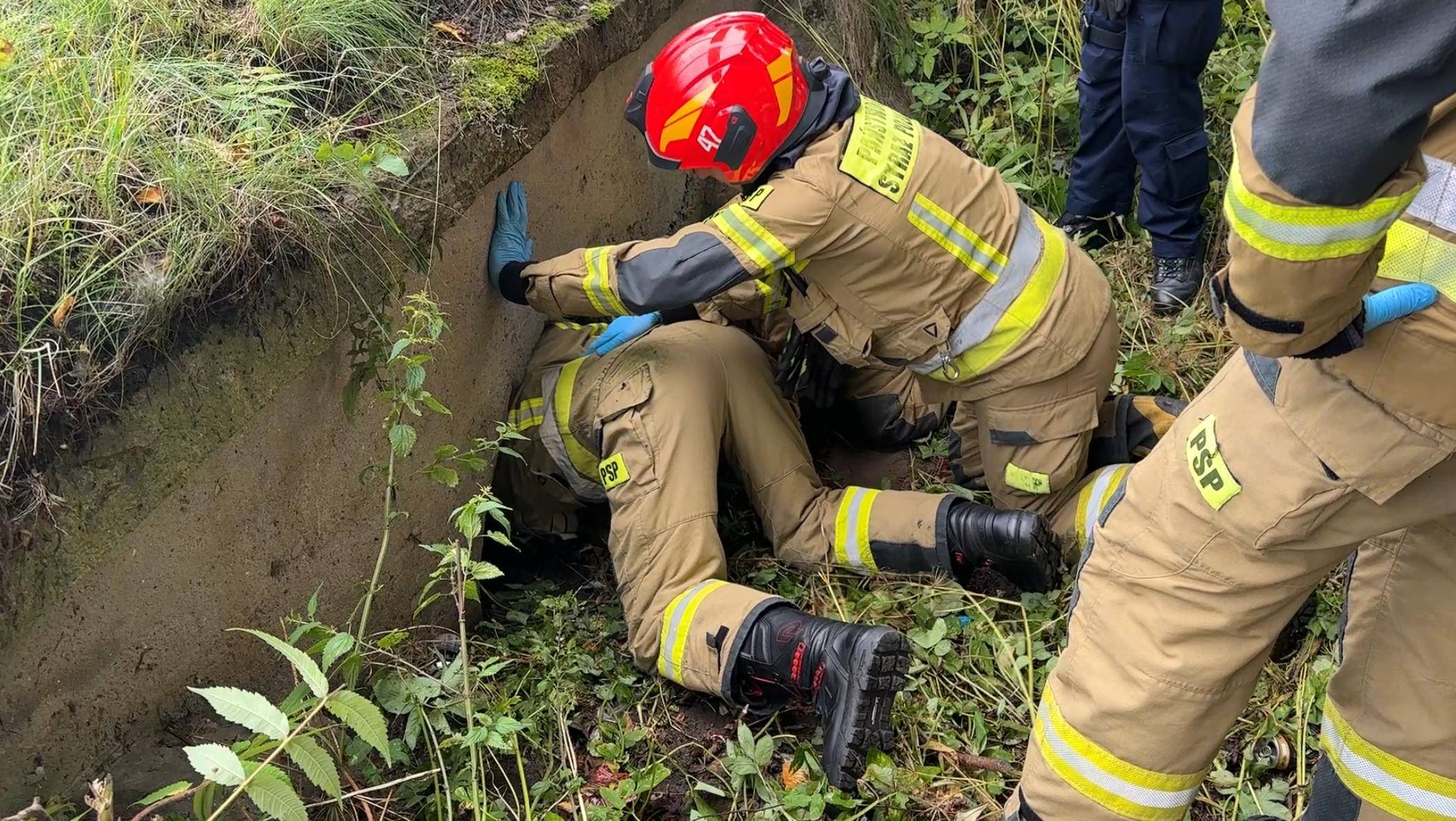 Po chwili na miejsce dotarli strażacy, którzy szybko ocenili sytuację i przystąpili do ewakuacji. Z pomocą przyszły nosze typu „deska", dzięki którym udało się bezpiecznie wydobyć poszkodowanego z przepustu.