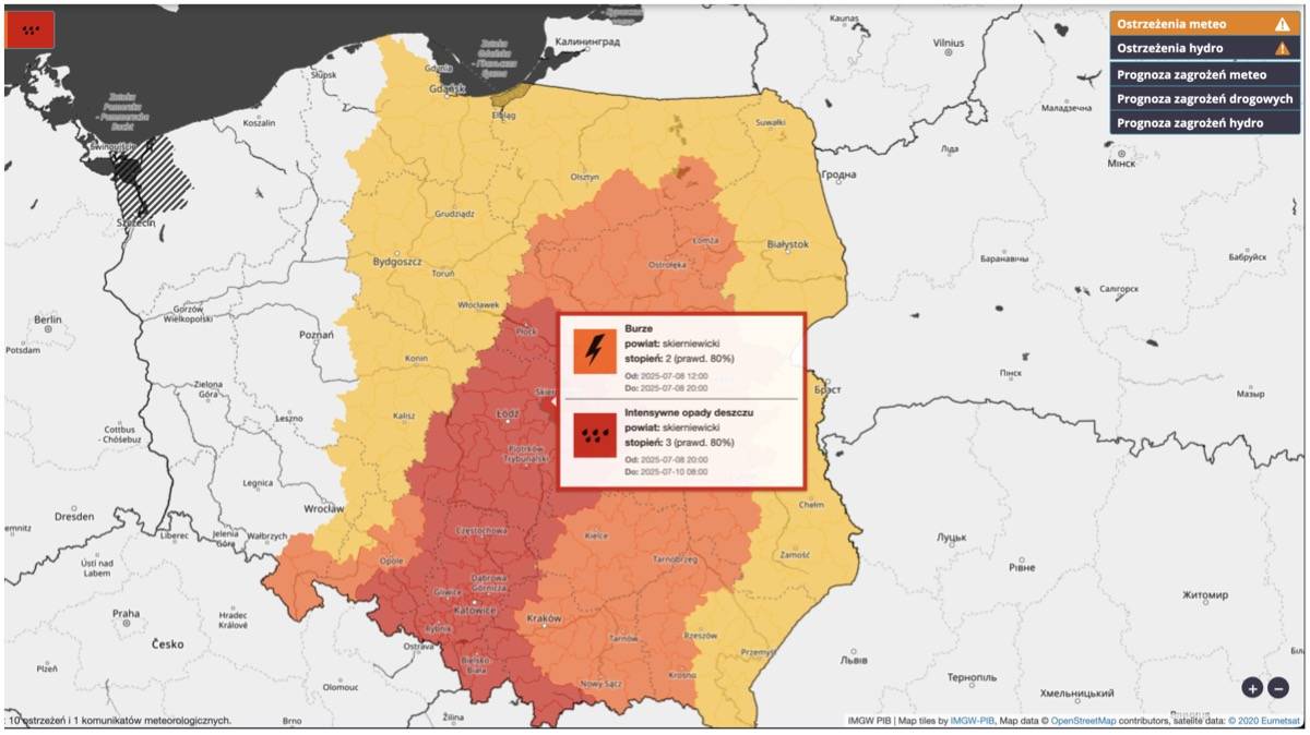 We wtorek, 8 lipca, w godzinach od 12:00 do 20:00, przewidywane są również burze, które mogą przybrać lokalnie gwałtowny charakter. IMGW wydał dwa poziomy ostrzeżeń burzowych, w zależności od intensywności zjawisk i lokalizacji.