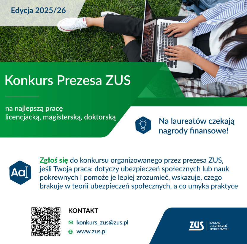 Zakład Ubezpieczeń Społecznych ogłasza V edycję Konkursu Prezesa ZUS na najlepszą pracę licencjacką, magisterską lub doktorską o ubezpieczeniach społecznych. Prace można zgłaszać do 30 września 2025 r. Celem konkursu jest popularyzacja tematyki ubezpieczeń społecznych w środowisku akademickim.
