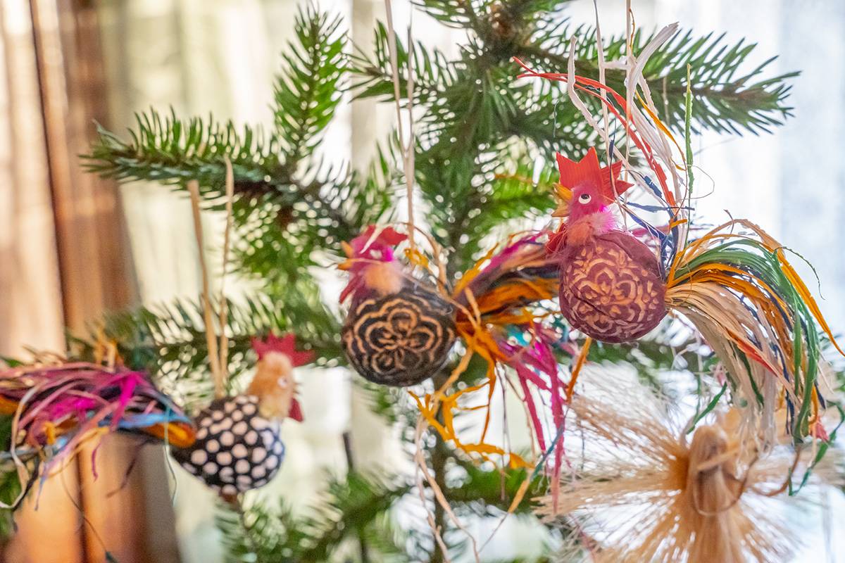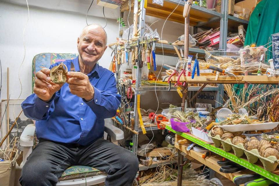 Bazą do wykonania tych niezwykłych, mikroskopijnych ozdób są tylko naturalne materiały: łupiny orzechów, żołędzie, główki makówek, kawałki drewna, traw, kora, mech, ziarnka zbóż. Jak mówi sam artysta, wykorzystuje to, co innym może wydawać się bezwartościowe. Jego pracownia to prawdziwy magazyn m.in. łupinek po orzechach włoskich, które ma w swoim ogrodzie, ale i które przynoszą mu ludzie. Pan Mariusz potrafi z nich wyczarować praktycznie wszystko – orzech może być dzikiem, pszczółką Mają, konikiem na biegunach, brzuchem Mikołaja, kulami bałwanka czy wózkiem dla malutkiej małpki. Każda ozdoba zachwyca precyzją wykonania i niewiarygodną fantazją autora. Figurki grają na instrumentach, wspinają się po linach, jeżdżą na wózeczkach.