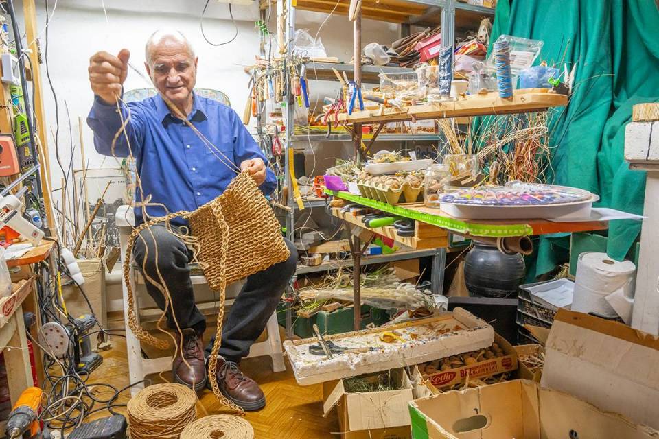 Na jego stoisku oprócz mikroskopijnych szopek i orzechowych dekoracji oraz zabawek, można znaleźć plecionki. Już nie kompozycje z suchymi kwiatami, ale wszystko, co podpowie wyobraźnia. Ze sznurka papierowego tworzy sztukę użytkową – plecaki, torby oraz kapelusze z najsłynniejszym, czyli kapeluszem Pilickim, regionalnym produktem z certyfikatem marki Dolina Pilicy Zwolnij Bieg. Ale są i cylindry, jest kapelusz czarodzieja, pleciony hełm strażacki czy czapka czołgisty.