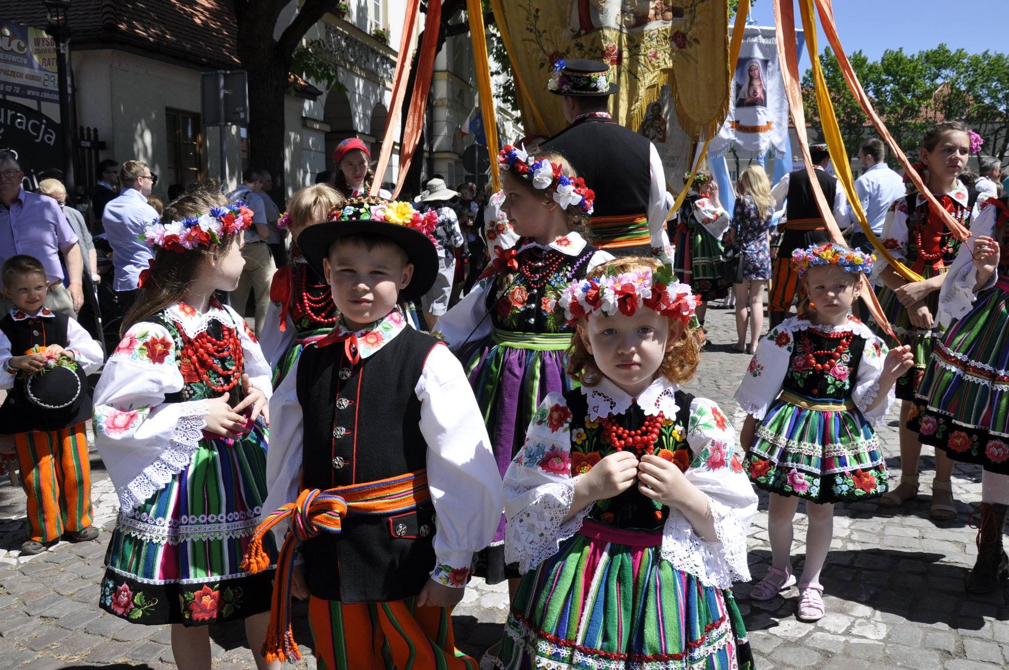 To właśnie łowicka procesja Bożego Ciała zyskała międzynarodową sławę – nie tylko dzięki swojej religijnej wymowie, lecz przede wszystkim za sprawą niezwykłej oprawy. Mieszkańcy Łowicza, zarówno dzieci, młodzież, jak i dorośli, zakładają tego dnia tradycyjne stroje ludowe – słynne „pasiaki" – będące dumą regionu. Stroje te, pełne soczystych kolorów i misternych haftów, to jeden z najbardziej rozpoznawalnych symboli polskiego folkloru, znany i ceniony nie tylko w kraju, ale i za granicą – pojawiały się na wystawach, w muzeach i pokazach etnograficznych od Nowego Jorku po Tokio.